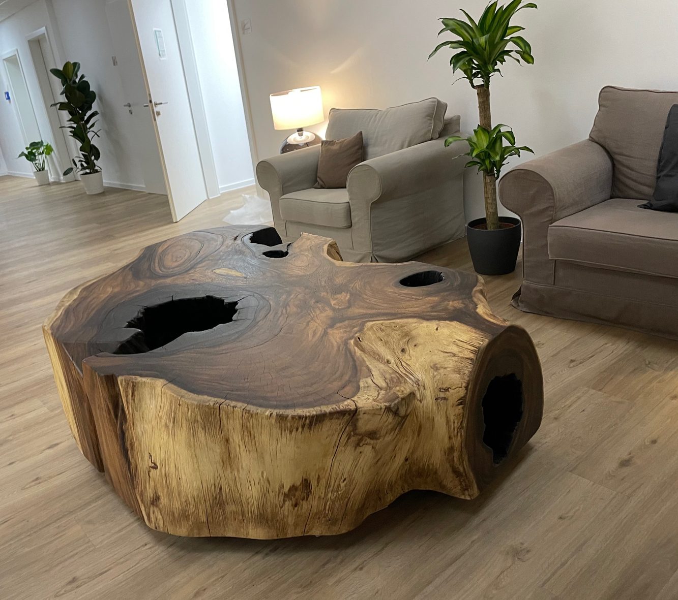 Unsere Holzplatten und Baumscheiben werden aus einem Stück der Mitte des Baumstammes geschnitten. Die anfallenden Reste werden für kleinere Möbelstücke verwendet. Wir reduzieren den Verschnitt auf ein Minimum.