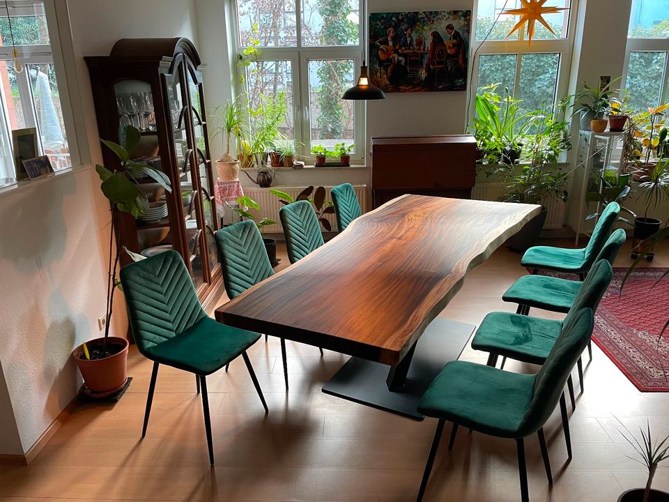 Egal, ob als Esstisch, Konferenztisch oder zentrales Statement-Stück, dieser Tisch vereint Funktionalität mit ästhetischer Anziehungskraft. Seine großzügigen Abmessungen bieten ausreichend Platz für Versammlungen oder besondere Momente.