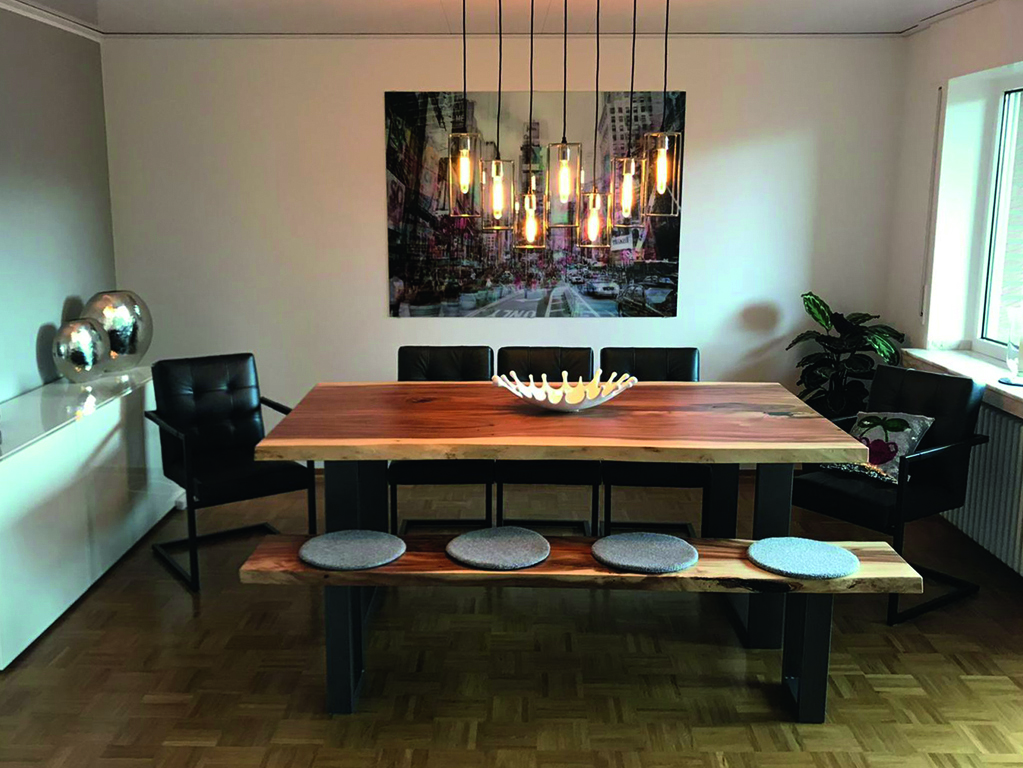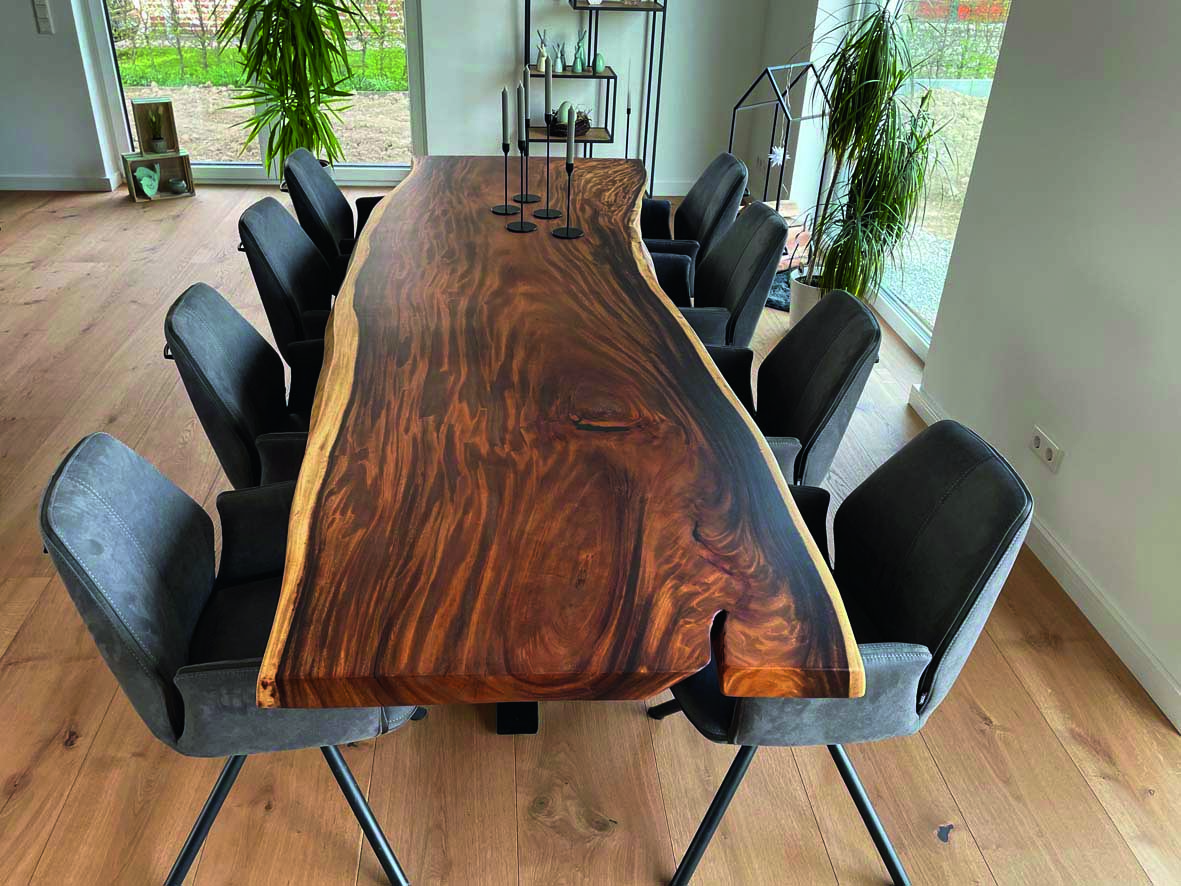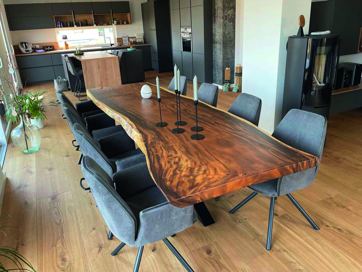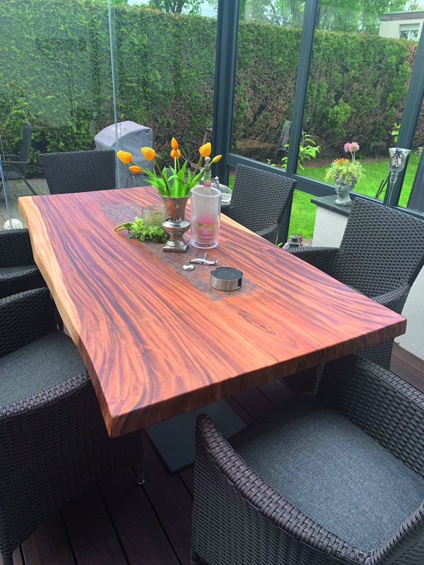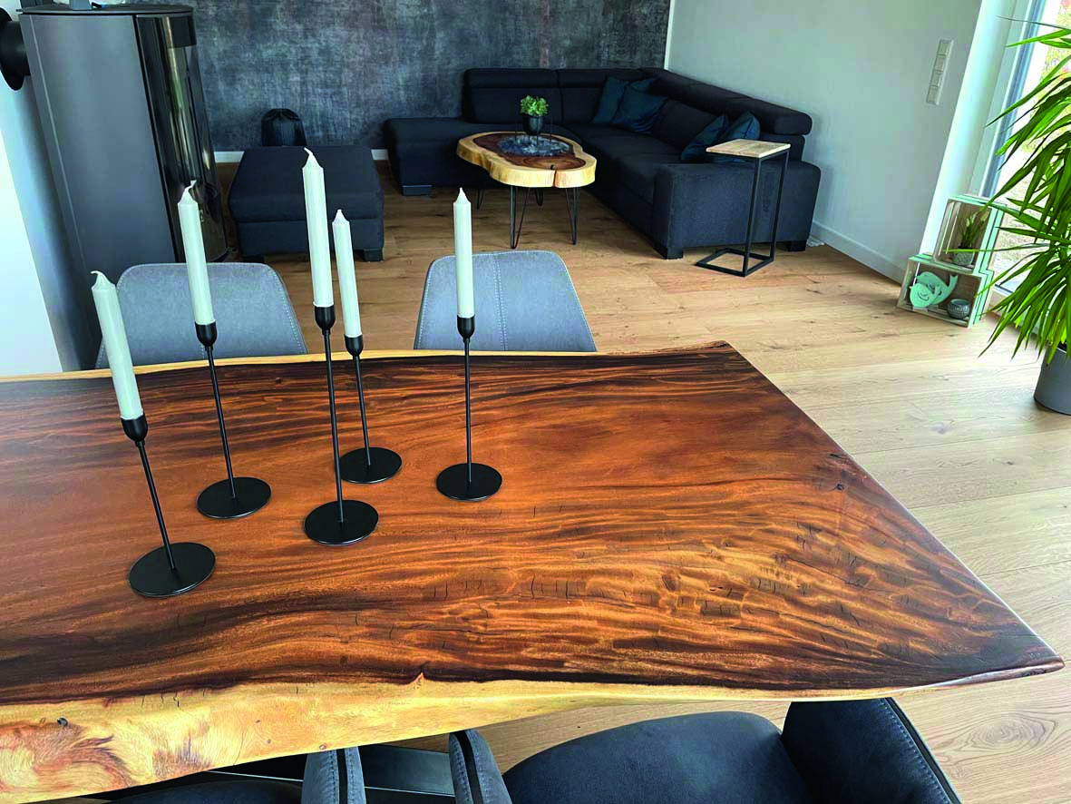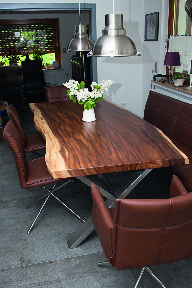 Es werden zwei verschiedene Oberflächen-Öle verwendet. Entweder HWS 2K 112 Öl (samtweich, reißfest und Maserstark) oder das HWS ECO (hier wird der natürliche helle Holz-Farbton mehr erhalten). Damit wird erreicht das die Tischplatte einen perfekten Schutz geboten bekommt und das Maserbild sehr stark ausgeprägt wird. Zum Ende wird HWS 3 Fach von Hand aufgetragen und mit einem Zwischenschliff und einer Zwischenpolierung veredelt! Nach der Oberflächenveredelung besteht jeder Tisch den Rotweintest und ist über Jahre geschützt und bedarf keiner weiteren Pflege.
