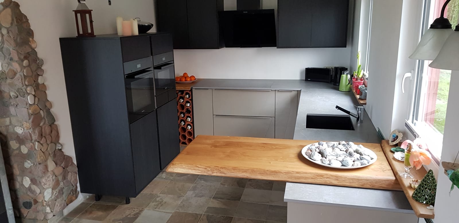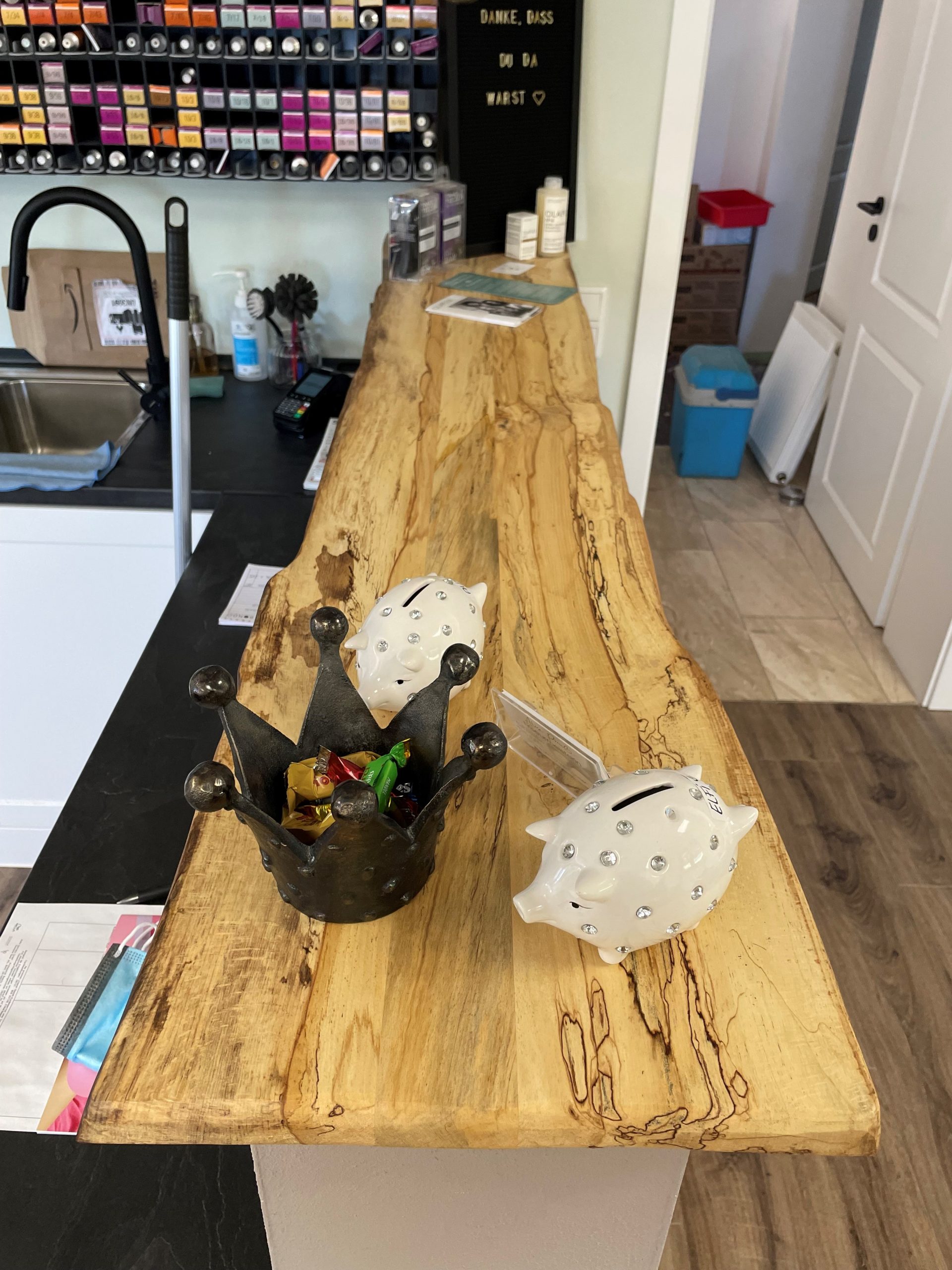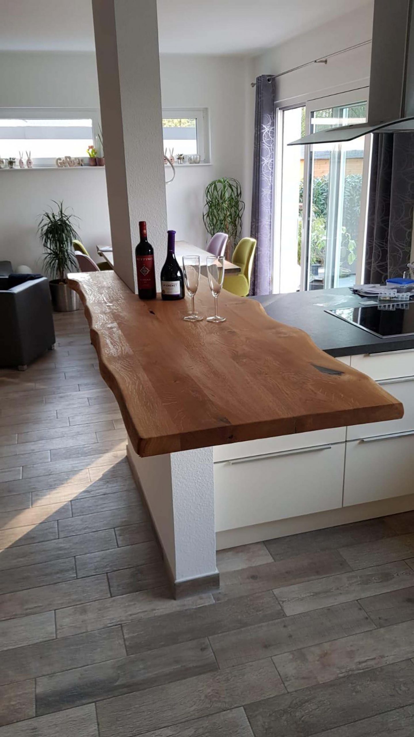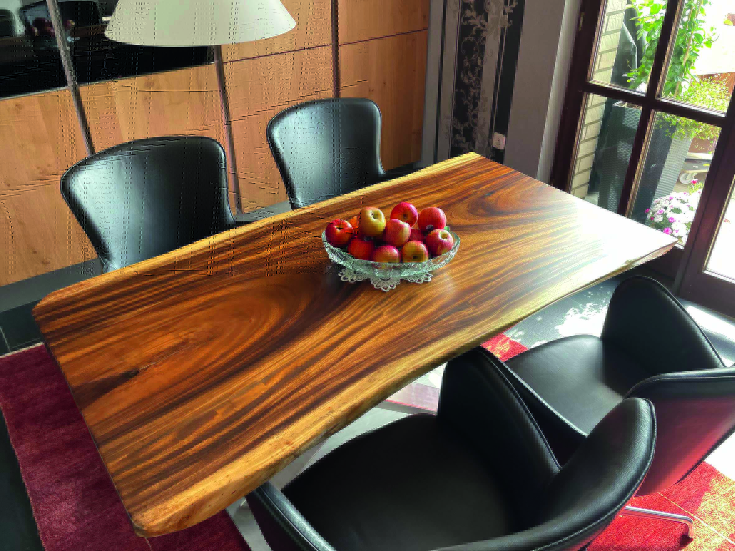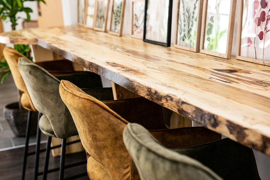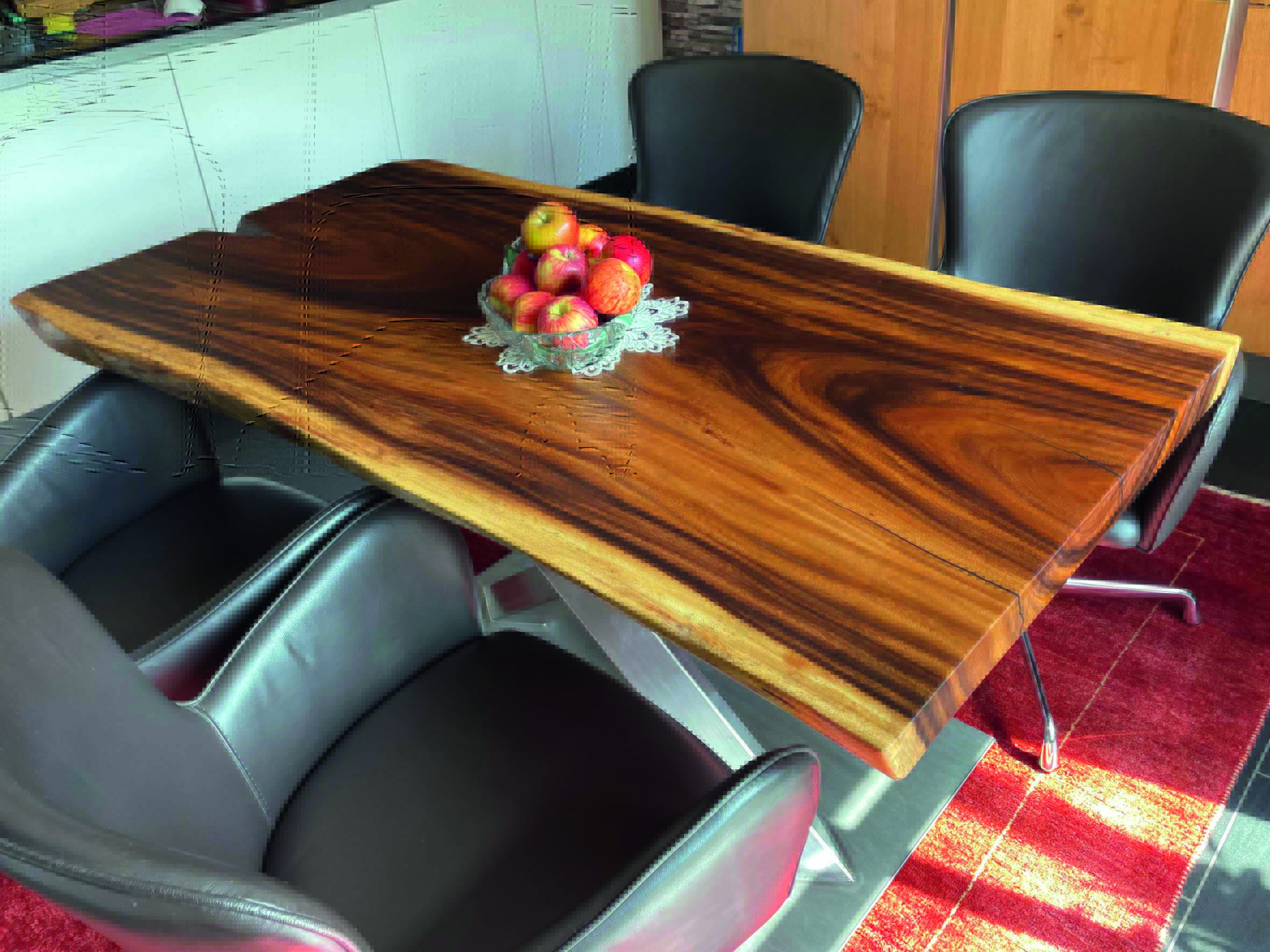 Es werden zwei verschiedene Oberflächen-Öle verwendet. Entweder HWS 2K 112 Öl (samtweich, reißfest und Maserstark) oder das HWS ECO (hier wird der natürliche helle Holz-Farbton mehr erhalten). Damit wird erreicht das die Tischplatte einen perfekten Schutz geboten bekommt und das Maserbild sehr stark ausgeprägt wird. Zum Ende wird HWS 3 Fach von Hand aufgetragen und mit einem Zwischenschliff und einer Zwischenpolierung veredelt! Nach der Oberflächenveredelung besteht jeder Tisch den Rotweintest und ist über Jahre geschützt und bedarf keiner weiteren Pflege.