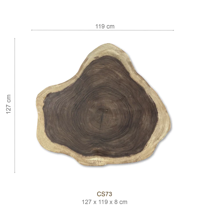Diese exquisite Suar-Baumscheibe, gefertigt aus einem einzigen Baumstamm, besticht durch ihre einzigartige Maserung und faszinierende Farbgebung. Sie fügt sich harmonisch in verschiedenste Einrichtungsstile ein und fungiert sowohl als praktisches Möbelstück als auch als dekoratives Highlight. Jede dieser Tischplatten erzählt ihre eigene Geschichte, verleiht jedem Raum Wärme und bringt ein Stück Natur ins Zuhause.