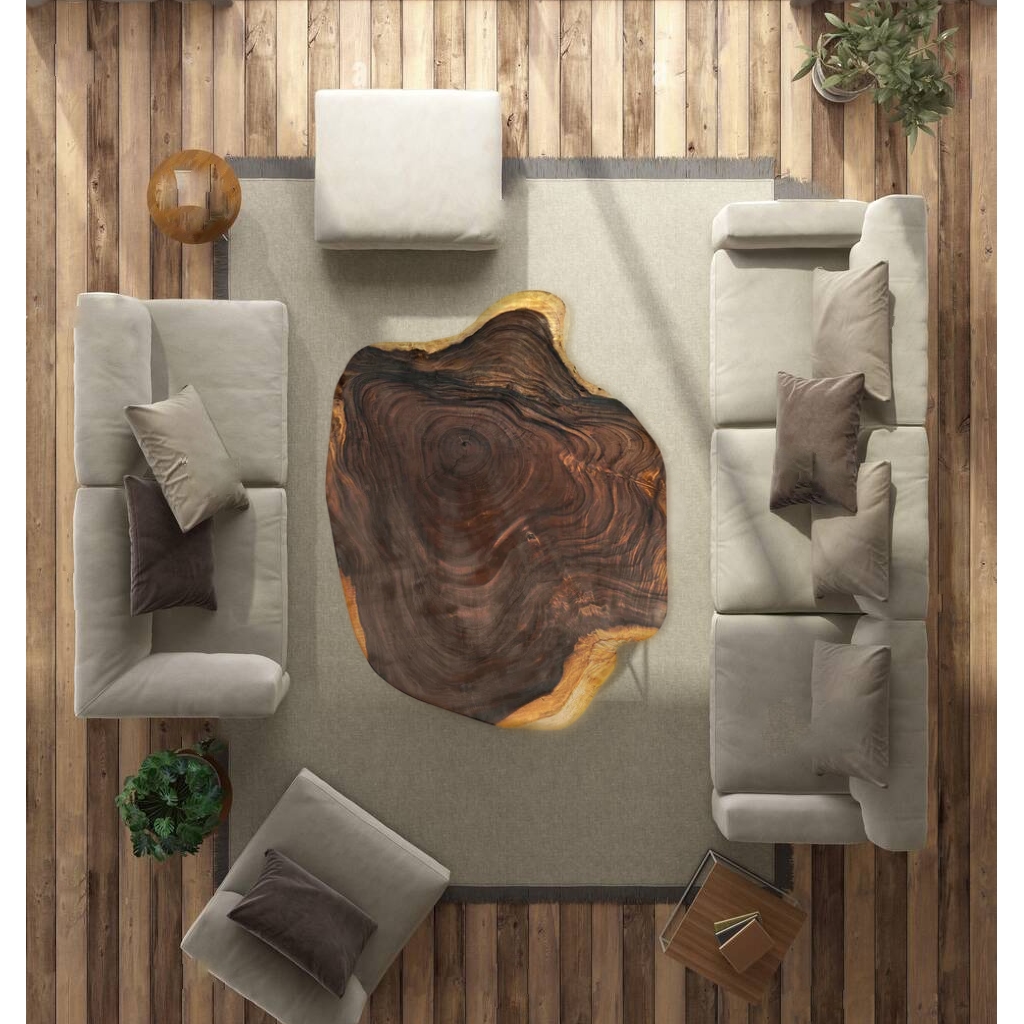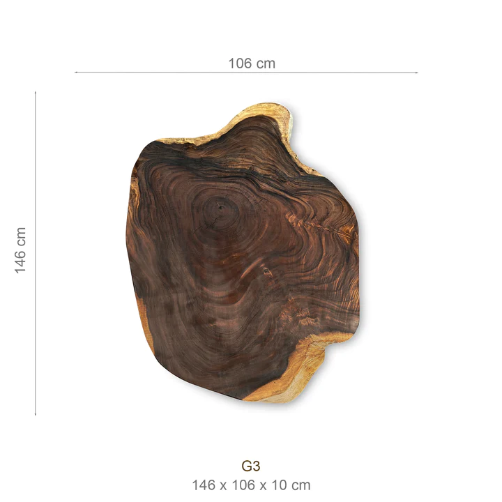 Diese exquisite Suar-Baumscheibe, gefertigt aus einem einzigen Baumstamm, besticht durch ihre einzigartige Maserung und faszinierende Farbgebung. Sie fügt sich harmonisch in verschiedenste Einrichtungsstile ein und fungiert sowohl als praktisches Möbelstück als auch als dekoratives Highlight. Jede dieser Tischplatten erzählt ihre eigene Geschichte, verleiht jedem Raum Wärme und bringt ein Stück Natur ins Zuhause.