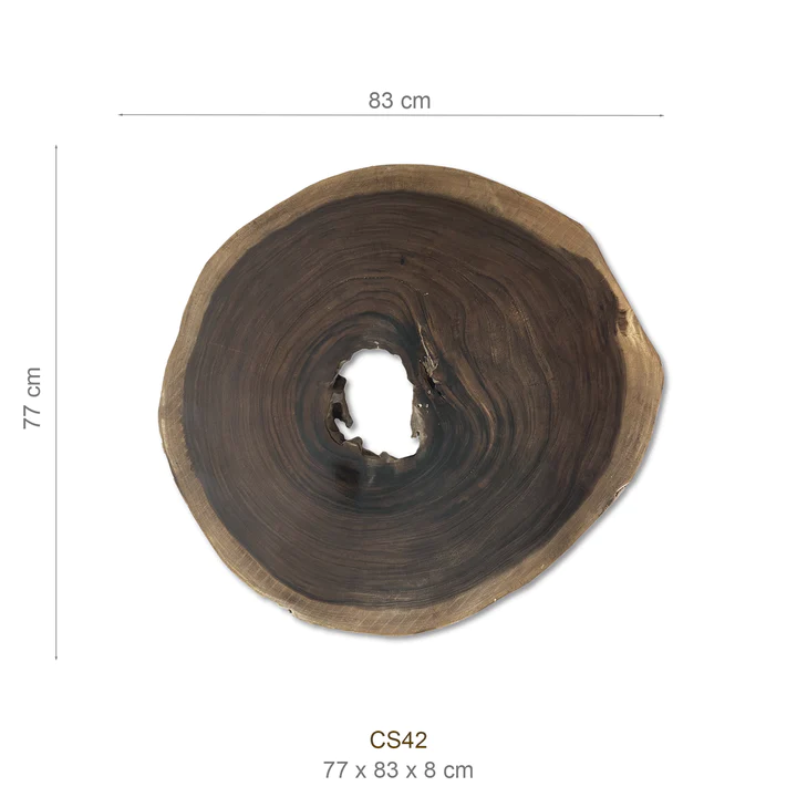Diese exquisite Suar-Baumscheibe, gefertigt aus einem einzigen Baumstamm, besticht durch ihre einzigartige Maserung und faszinierende Farbgebung. Sie fügt sich harmonisch in verschiedenste Einrichtungsstile ein und fungiert sowohl als praktisches Möbelstück als auch als dekoratives Highlight. Jede dieser Tischplatten erzählt ihre eigene Geschichte, verleiht jedem Raum Wärme und bringt ein Stück Natur ins Zuhause.