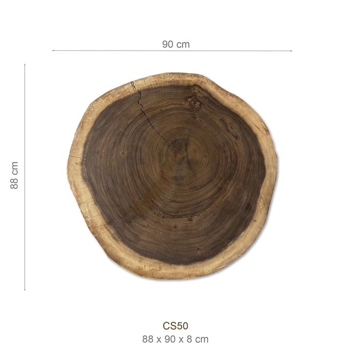 Diese exquisite Suar-Baumscheibe, gefertigt aus einem einzigen Baumstamm, besticht durch ihre einzigartige Maserung und faszinierende Farbgebung. Sie fügt sich harmonisch in verschiedenste Einrichtungsstile ein und fungiert sowohl als praktisches Möbelstück als auch als dekoratives Highlight. Jede dieser Tischplatten erzählt ihre eigene Geschichte, verleiht jedem Raum Wärme und bringt ein Stück Natur ins Zuhause.