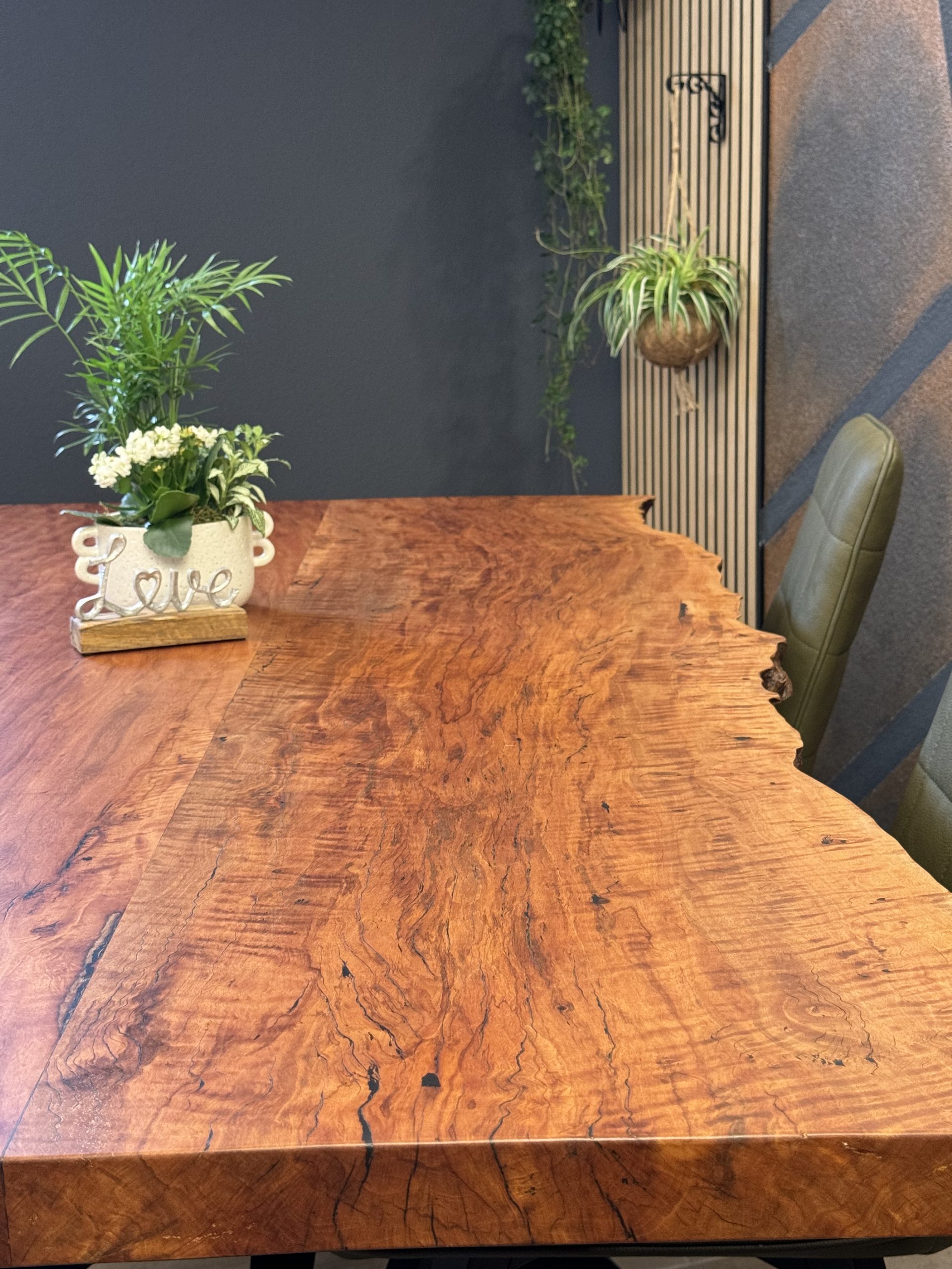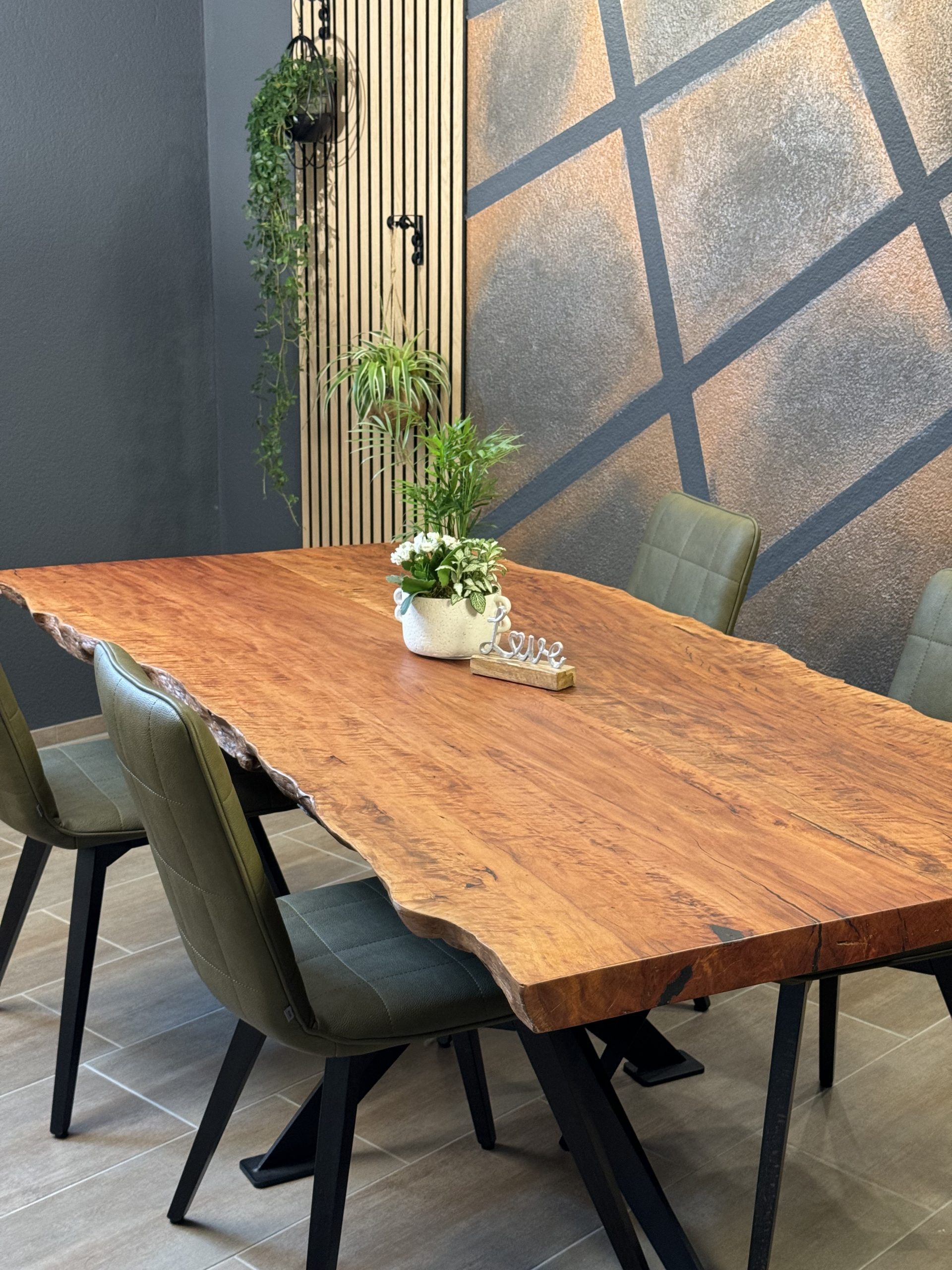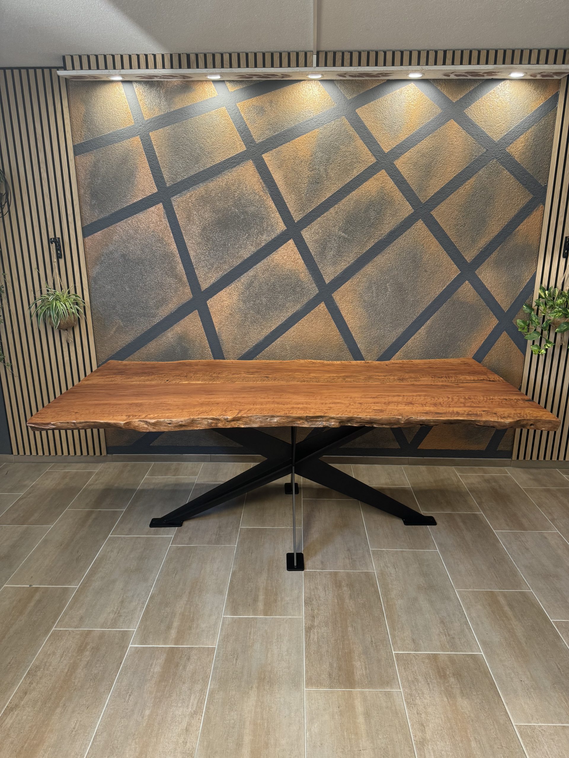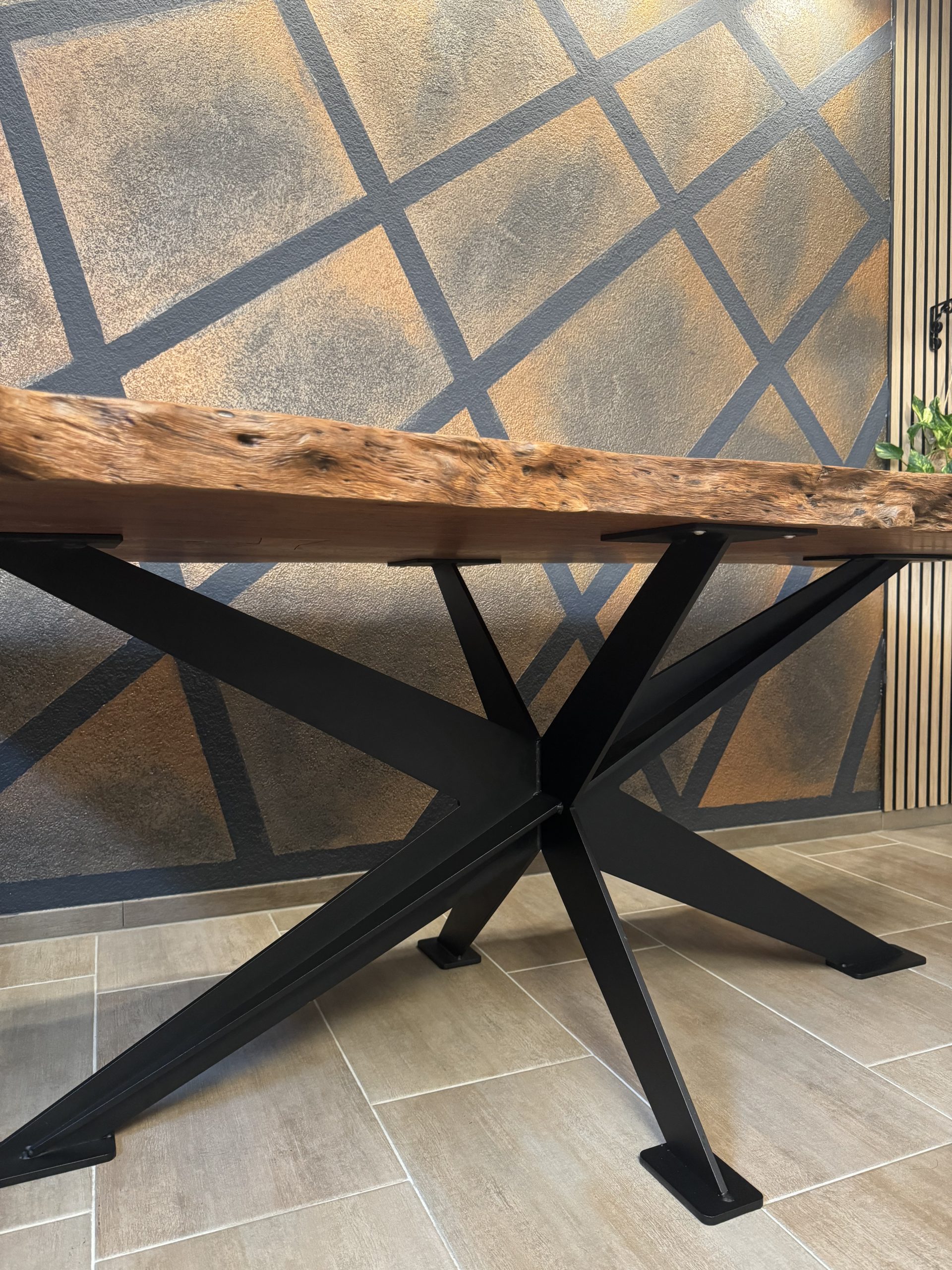 Dieser exklusive Tisch wurde aus feinstem Litschiholz gefertigt und dreifach geschliffen, um die natürliche Schönheit des Holzes in vollem Glanz erstrahlen zu lassen. Das Holz wurde in einem Stück verarbeitet und sorgfältig gespiegelt, um ein harmonisches und ästhetisches Gesamtbild zu schaffen. Mit einer speziellen Ölbehandlung veredelt, verleiht dieser Tisch jedem Raum eine warme und edle Optik. Das Spider Gestell ist aus massivem Stahl gefertigt und schwarz pulverbeschichtet.