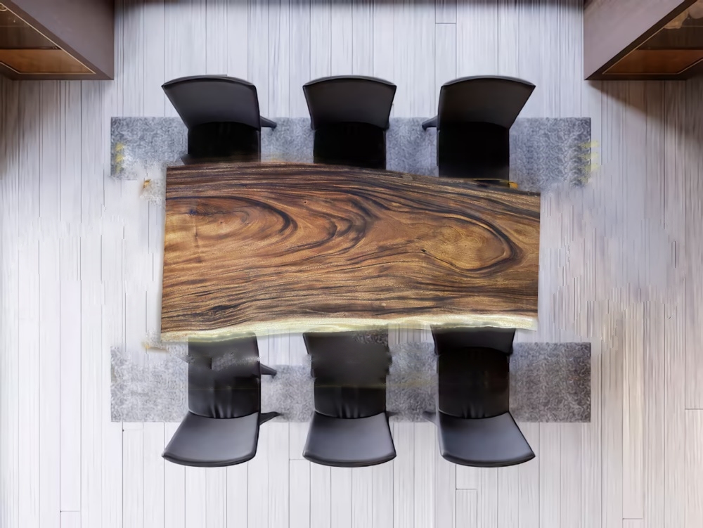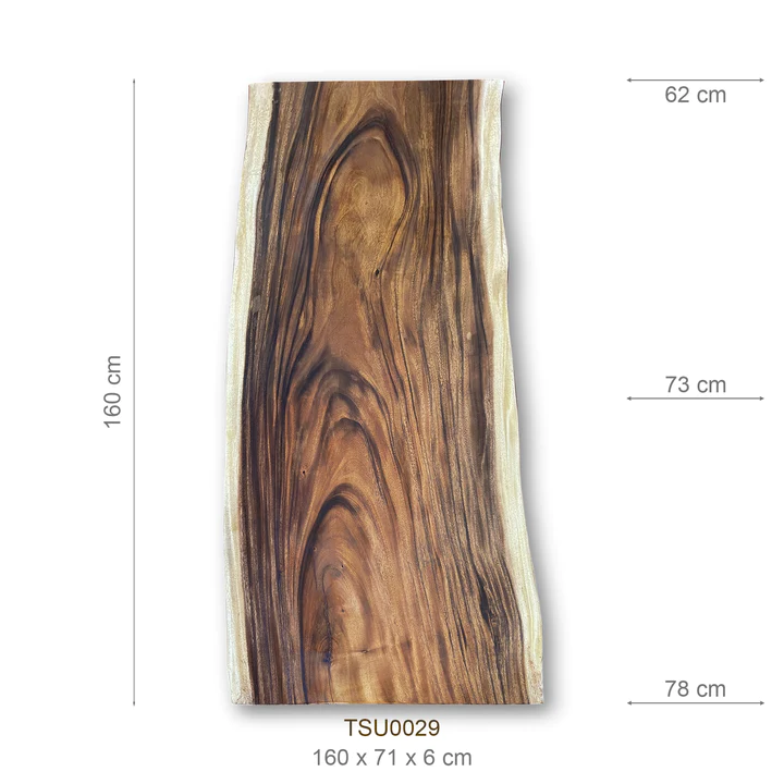 Diese exquisite Suar-Tischplatte, gefertigt aus einem einzigen Baumstamm, besticht durch ihre einzigartige Maserung und faszinierende Farbgebung. Sie fügt sich harmonisch in verschiedenste Einrichtungsstile ein und fungiert sowohl als praktisches Möbelstück als auch als dekoratives Highlight. Jede dieser Tischplatten erzählt ihre eigene Geschichte, verleiht jedem Raum Wärme und bringt ein Stück Natur ins Zuhause.