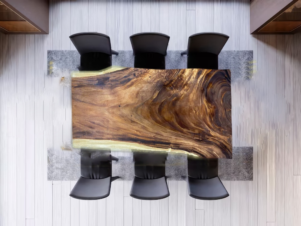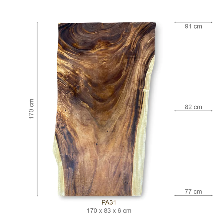 Diese exquisite Suar-Tischplatte, gefertigt aus einem einzigen Baumstamm, besticht durch ihre einzigartige Maserung und faszinierende Farbgebung. Sie fügt sich harmonisch in verschiedenste Einrichtungsstile ein und fungiert sowohl als praktisches Möbelstück als auch als dekoratives Highlight. Jede dieser Tischplatten erzählt ihre eigene Geschichte, verleiht jedem Raum Wärme und bringt ein Stück Natur ins Zuhause.