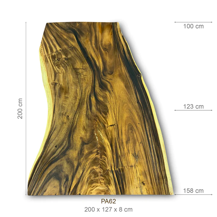 Diese exquisite Suar-Tischplatte, gefertigt aus einem einzigen Baumstamm, besticht durch ihre einzigartige Maserung und faszinierende Farbgebung. Sie fügt sich harmonisch in verschiedenste Einrichtungsstile ein und fungiert sowohl als praktisches Möbelstück als auch als dekoratives Highlight. Jede dieser Tischplatten erzählt ihre eigene Geschichte, verleiht jedem Raum Wärme und bringt ein Stück Natur ins Zuhause.