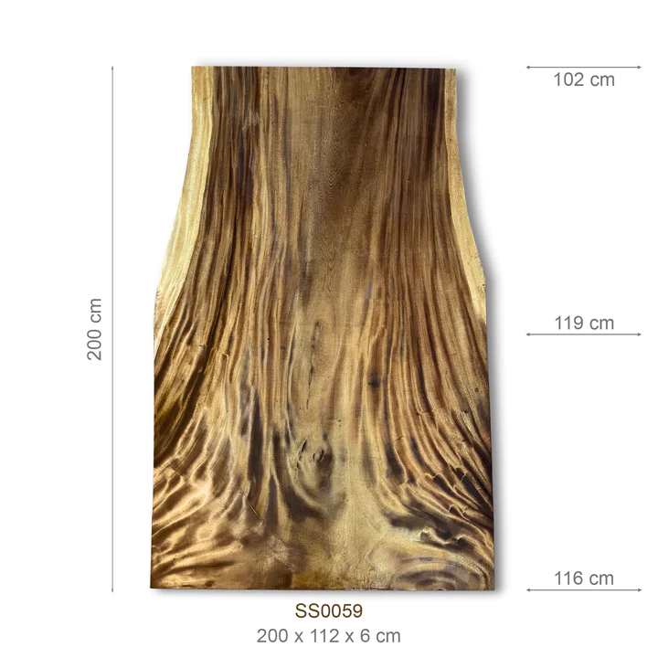 Diese exquisite Suar-Tischplatte, gefertigt aus einem einzigen Baumstamm, besticht durch ihre einzigartige Maserung und faszinierende Farbgebung. Sie fügt sich harmonisch in verschiedenste Einrichtungsstile ein und fungiert sowohl als praktisches Möbelstück als auch als dekoratives Highlight. Jede dieser Tischplatten erzählt ihre eigene Geschichte, verleiht jedem Raum Wärme und bringt ein Stück Natur ins Zuhause.