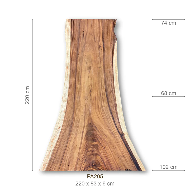 Diese exquisite Suar-Tischplatte, gefertigt aus einem einzigen Baumstamm, besticht durch ihre einzigartige Maserung und faszinierende Farbgebung. Sie fügt sich harmonisch in verschiedenste Einrichtungsstile ein und fungiert sowohl als praktisches Möbelstück als auch als dekoratives Highlight. Jede dieser Tischplatten erzählt ihre eigene Geschichte, verleiht jedem Raum Wärme und bringt ein Stück Natur ins Zuhause.