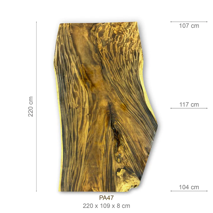 Diese exquisite Suar-Tischplatte, gefertigt aus einem einzigen Baumstamm, besticht durch ihre einzigartige Maserung und faszinierende Farbgebung. Sie fügt sich harmonisch in verschiedenste Einrichtungsstile ein und fungiert sowohl als praktisches Möbelstück als auch als dekoratives Highlight. Jede dieser Tischplatten erzählt ihre eigene Geschichte, verleiht jedem Raum Wärme und bringt ein Stück Natur ins Zuhause.