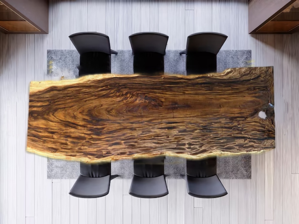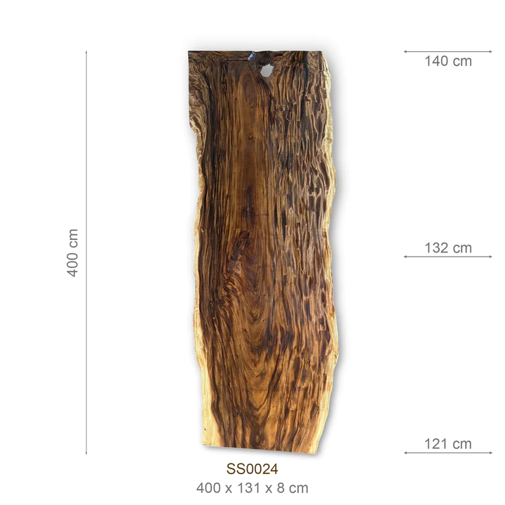 Diese exquisite Suar-Tischplatte, gefertigt aus einem einzigen Baumstamm, besticht durch ihre einzigartige Maserung und faszinierende Farbgebung. Sie fügt sich harmonisch in verschiedenste Einrichtungsstile ein und fungiert sowohl als praktisches Möbelstück als auch als dekoratives Highlight. Jede dieser Tischplatten erzählt ihre eigene Geschichte, verleiht jedem Raum Wärme und bringt ein Stück Natur ins Zuhause.